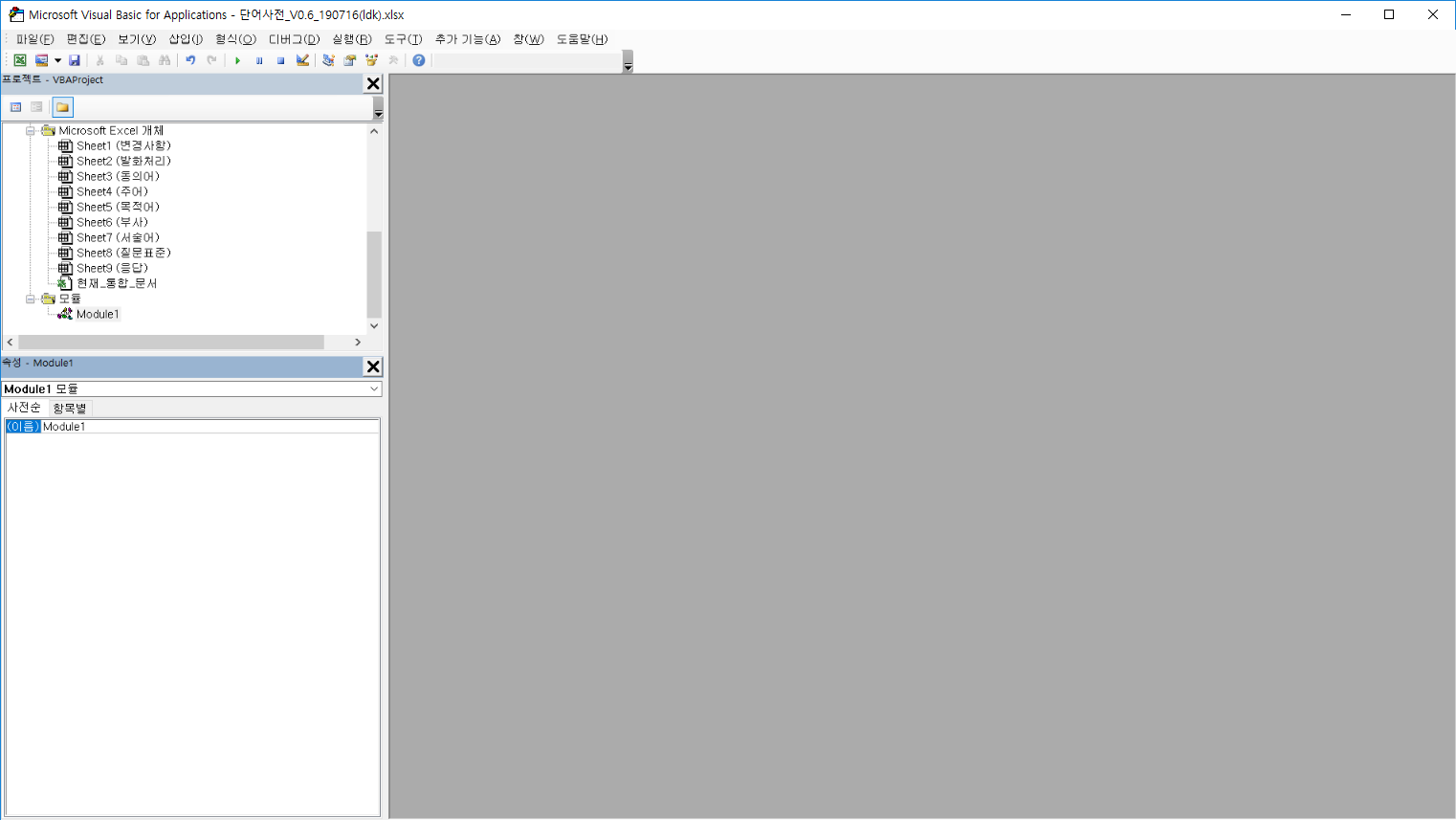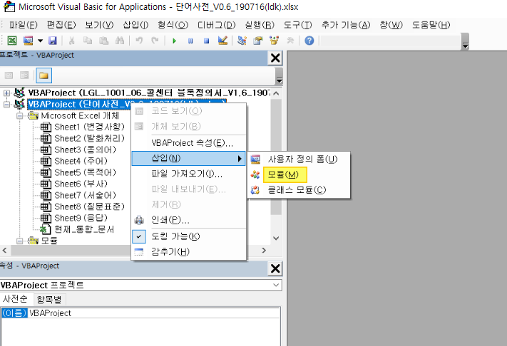이런 VBA(Visual Basic for Applications) 창이 실행 됨